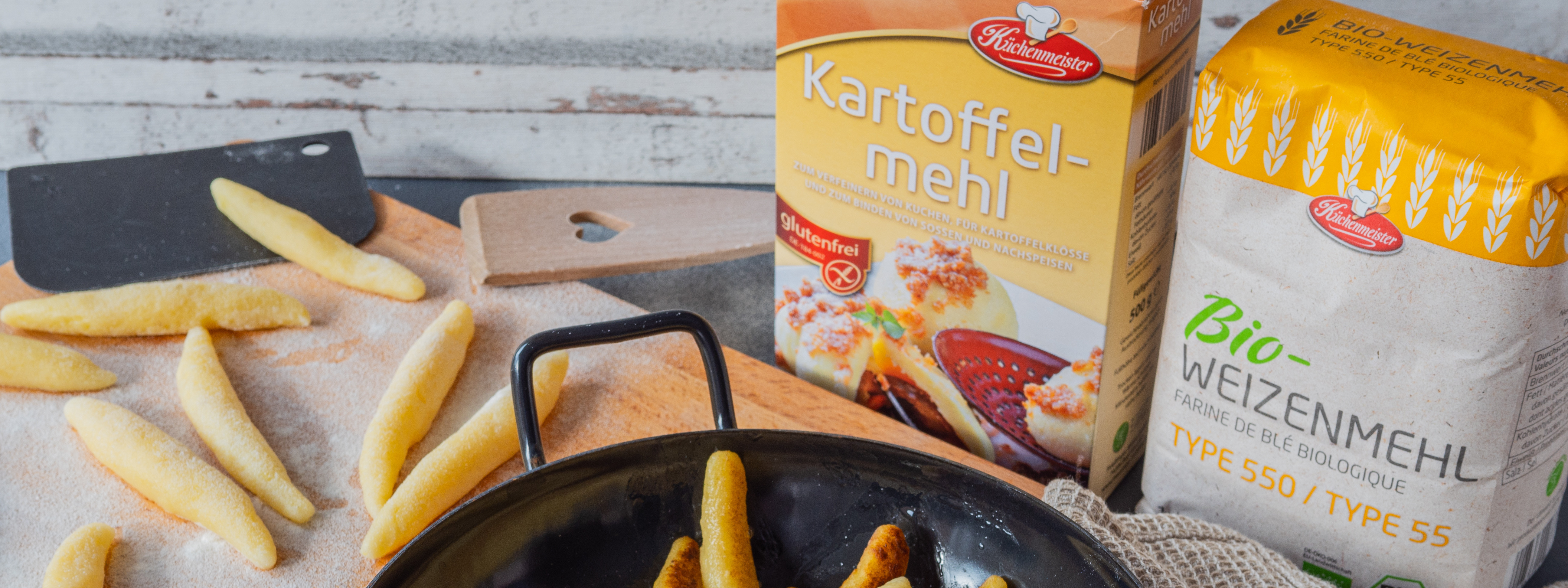 Zubereitung: 800 g Kartoffeln mit der Schale weichkochen, das Wasser abgießen und komplett auskühlen lassen. Dann schälen und durch eine Kartoffelpresse drücken oder fein reiben. Mit den restlichen Zutaten zu einem festeren Teig verarbeiten.