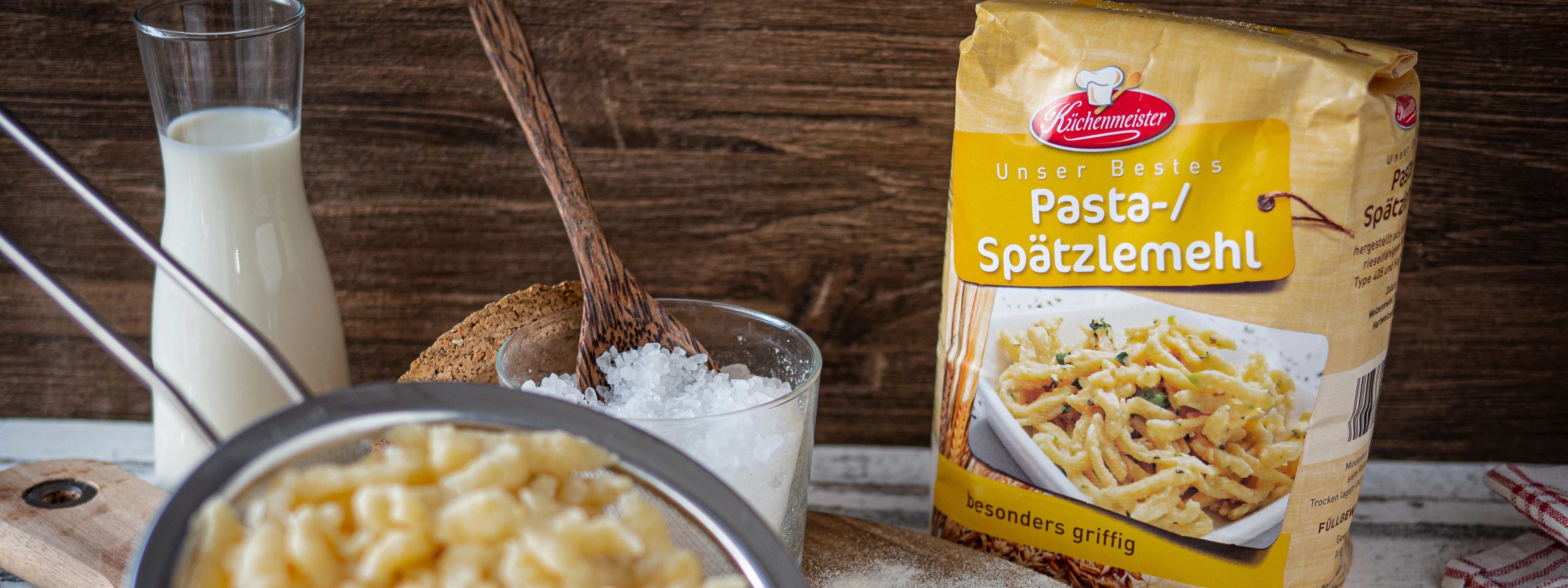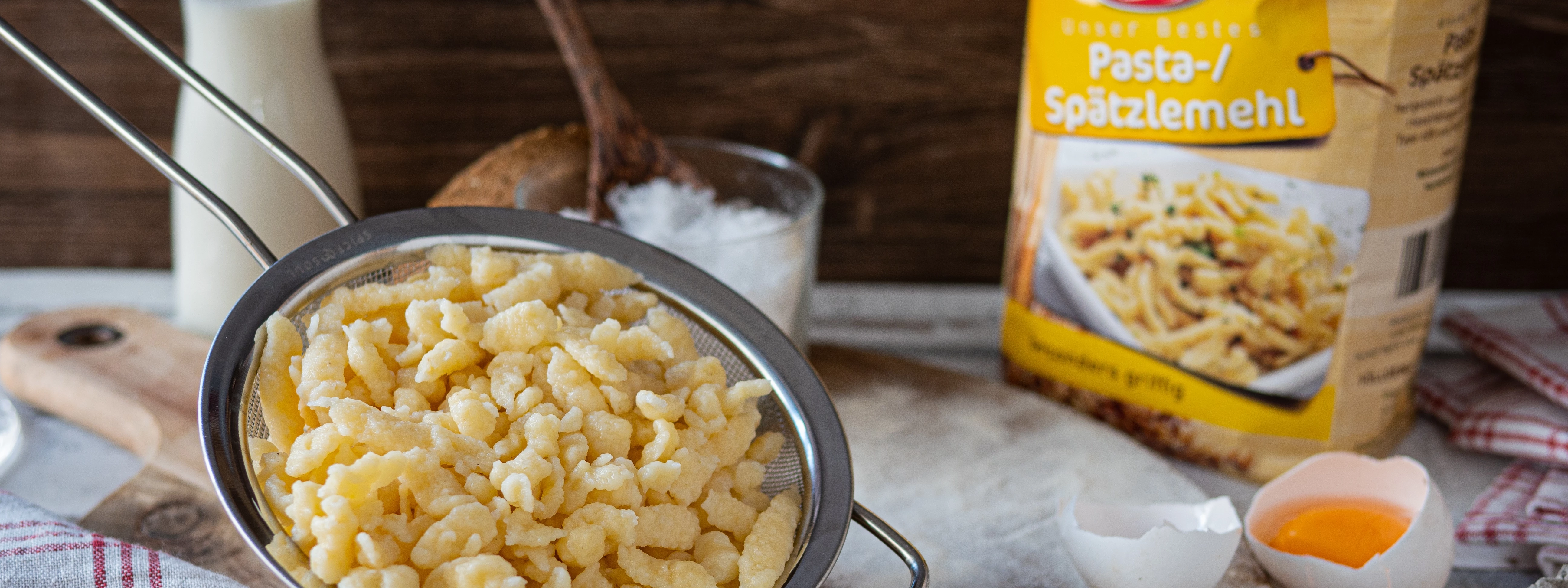 Zubereitung: 500 g Mehl mit 1 TL Salz, 350 ml Milch und 2 Eiern zu einem zähflüssigen Teig verrühren. Sollte die Konsistenz des Teiges zu flüssig oder zu fest sein, einfach mit Mehl (zu flüssig) oder Milch (zu fest) nacharbeiten. Den Teig mit einem Spätzlehobel in reichlich kochendes Salzwasser reiben. Einmal aufkochen lassen. Die Spätzle aus dem Wasser schöpfen und gut abtropfen lassen.
